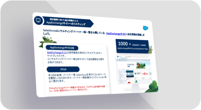 - 案件獲得に向けた基本情報の入力 - AppExchangeサイトへのリスティング 1 AAAAA AAAAAAAAA AAAAAAAAA 多くのお客様、パートナー様、Salesforce社員がこちらのページ を閲覧しておりますので、パートナー様情報のインプレッション向 上に繋がります。 ※AppExchangeサイトへ掲載ができるのは、プログラム参加要件を満 たし、正式に認定されたパートナー様のみです。 メリット 15 AppExchangeサイトは世界最高水準のビジネスアプリのマー ケットプレイスです。 コンサルティングパートナー様も同サイトにて会社概要を公開す る事ができます。 AppExchangeサイトとは Salesforceコンサルティングパートナー様一覧を公開している AppExchangeサイトに会社情報を掲載しま しょう。 1000 + viewers / week AppExchangeサイトConsulting Partner Page