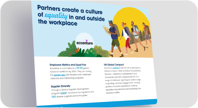 Partners create a culture of equality in and outside the workplace Employee Metrics and Equal Pay UN Global Compact Accenture is committed to a 50-50 gender Accenture partners with the UN to develop the balanced workforce by 2025. They are closing Global Compact. With Accenture Sustainability the gender gap with flexible work, employee Services + Salesforce Sustainability Cloud, networks and mentorship programs. companies can track, measure and act on a range of initiatives: reporting on carbon usage, Supplier Diversity supporting customer engagements, creating Through a Diverse Supplier Development positive consumer experiences, meeting program (DSDP), Accenture has registered over regulatory requirements and developing new 165 diverse suppliers across the globe. business models. CHAPTER 4: EXPAND | 17