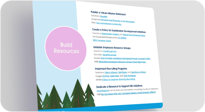 Publish a Values Mission Statement Salesforce Equality Accenture Inclusion and Diversity in the Workspace PWC Our commitment to diversity Create a Policy for Sustainable Development Initiatives Salesforce Stakeholder Impact and Global Environmental Policy UN Sustainable Development 17 GOALS SDG Compass Guide Build Establish Employee Resource Groups Resources Salesforce equality groups DocuSign equality groups Forbes How to foster workplace belonging through successful ERGs HBR What Black Employee Resource Groups Need Right Now Implement Recruiting Programs Salesforce Talent Alliance, Pathfinder and Salesforce military Google CS First, Code Next, and Tech Exchange SHRM 5 Steps to Improve Diversity Recruiting Dedicate a Resource to Support D&I Initiatives Tony Prophet and his team are dedicated to advancing equality at Salesforce HBR Do You Know Why Your Company Needs a Chief Diversity Officer? CHAPTER 5: ITERATE | 22