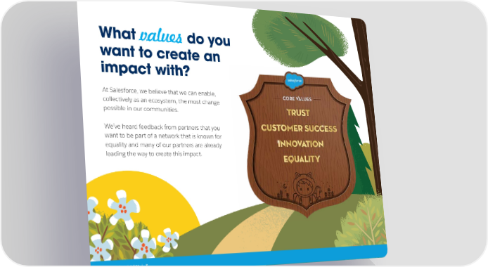 What do you values want to create an impact with? At Salesforce, we believe that we can enable, collectively as an ecosystem, the most change possible in our communities. We’ve heard feedback from partners that you want to be part of a network that is known for equality and many of our partners are already leading the way to create this impact. CHAPTER 1: LEARN | 7
