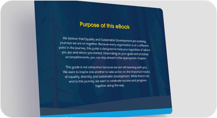 Purpose of this eBook We believe that Equality and Sustainable Development are evolving journeys we are on together. Because every organization is at a different point in the journey, this guide is designed to help you regardless of where you are and where you started. Depending on your goals and previous accomplishments, you can skip ahead to the appropriate chapter. This guide is not exhaustive because we are still learning with you. We want to inspire one another to take action on the important topics of equality, diversity, and sustainable development. While there’s no end to this journey, we want to celebrate success and progress together along the way. PURPOSE OF THIS EBOOK | 4