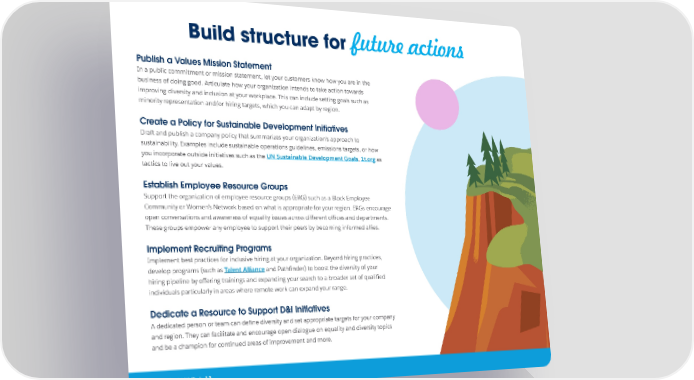 Build structure for future actions Publish a Values Mission Statement In a public commitment or mission statement, let your customers know how you are in the business of doing good. Articulate how your organization intends to take action towards improving diversity and inclusion at your workplace. This can include setting goals such as minority representation and/or hiring targets, which you can adapt by region. Create a Policy for Sustainable Development Initiatives Draft and publish a company policy that summarizes your organization’s approach to sustainability. Examples include sustainable operations guidelines, emissions targets, or how you incorporate outside initiatives such as the UN Sustainable Development Goals, 1t.org as tactics to live out your values. Establish Employee Resource Groups Support the organization of employee resource groups (ERG) such as a Black Employee Community or Women’s Network based on what is appropriate for your region. ERGs encourage open conversations and awareness of equality issues across different offices and departments. These groups empower any employee to support their peers by becoming informed allies. Implement Recruiting Programs Implement best practices for inclusive hiring at your organization. Beyond hiring practices, develop programs (such as Talent Alliance and Pathfinder) to boost the diversity of your hiring pipeline by offering trainings and expanding your search to a broader set of qualified individuals particularly in areas where remote work can expand your range. Dedicate a Resource to Support D&I Initiatives A dedicated person or team can define diversity and set appropriate targets for your company and region. They can facilitate and encourage open dialogue on equality and diversity topics and be a champion for continued areas of improvement and more. CHAPTER 3: BUILD | 13