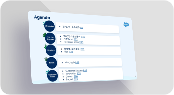 FY26 Key Changes Agenda Introduction ● 活用リソースの紹介 P.5 Structure Benefit ● プログラム参加要件 P.16 ● ベネフィット P.22 ● Trailblazer Score P.23 ● 年会費/契約更新 P.31 ● Tier P.33 ● ベネフィット P.38 4 Trailblazer Score ● Customer Success P.47 ● Innovation P.53 ● Growth P.66 ● Impact P.73