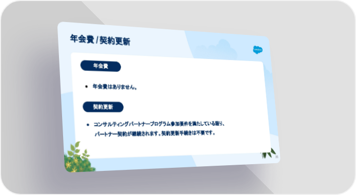 [Internnal/External] FY26 Page 30 Page 32年会費/契約更新 31 年会費 契約更新 ● 年会費はありません。 ● コンサルティングパートナープログラム参加要件を満たしている限り、 パートナー契約が継続されます。契約更新手続きは不要です。