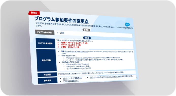 ● 2資格 プログラム参加要件の変更点 プログラム参加要件が変更されました。FY26末(2026年1月31日)までに新要件を満たしていただかないと、パートナー契約が無効とな ります。 要対応 変更前 プログラム参加要件 下記3つのうちいずれか1つの要件を満たしてください。 ● 2 資格 + ステージ 2 以上のリード 1件 ● ステージ 2以上のリード 3件 ● 2 資格 + プロジェクト 2件 プログラム参加要件 変更後 ● 資格: Partner Program Certificationsページの“Meets Minimum Requirements”の”Consulting & MSP Tracks”列にチェックマーク が記載 ● リード: 下記全てに該当 ○ What type of Lead are you creating?で「Reseller」ではなく「Referral」を選択して登録されたリード ○ パートナーリードから創出された商談が過去12ヶ月以内にステージ2以上に到達 (その後失注しても対象) ● プロジェクト : 下記全てに該当 ○ ①Projectのステータスが“Completed” ○ ②Project End Dateが過去12ヶ月以内 ○ ③プロジェクト登録時にOrg IDが入力済み 要件の定義 FY26末(2026年1月31日)までに新要件を満たしていただかないと、パートナー契約が無効となります。 対応期限 ● パートナーリード登録ガイド ● プロジェクト登録ガイド 参考資料 16 ● FAQ - コンサルティングパートナープログラム参加要件の変更について