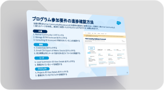 プログラム参加要件の進捗確認方法 当面の間はPartner CommunityのScorecardより各要件の進捗をご確認ください。将来的にはPartner Community上 に新たなページを作成し、進捗をご確認いただけるようになる予定ですが、時期は未定です。 1. Partner Community にログインする 2. Manage タブの Scorecard をクリックする 3. Consulting の Scorecard が表示されていることを確認する 共通 FY25 Consulting Trailblazer Scorecard 21 4. Credentials をクリックする 5. Email CSV Export of Metric Details をクリックする 6. 約1時間以内にメールで送付されるCSV ファイルを確認する 資格 4. Lead Submission の View Details をクリックする 5. 登録されているリードを確認する リード 4. Projects の View Details をクリックする 5. 登録されているプロジェクトを確認する プロジェクト