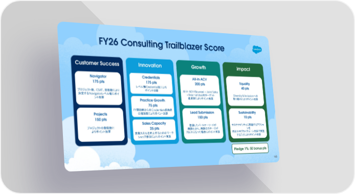 Customer Success Navigator 175 pts プロジェクト数、 CSAT、資格数により 決定するNavigatorレベル毎にポイ ント加算 Projects 150 pts プロジェクトの登録数に よりポイント加算 Innovation Credentials 175 pts レベル別Credential数により ポイント加算 Growth All-in ACV 200 pts All-in ACV (Sourced + Joint Sales + Internal Use)のターゲット 達成率によりポイント加算 Impact Equality 40 pts Diversity & Inclusionへの 取り組みによりポイント加算 Sustainability 10 pts サステナビリティに関連するアクショ ンを 自社やサプライチェーン全体で実施 することによりポイント加算 Lead Submission 150 pts 登録したパートナーリードが 商談化され、商談のステージが 2以上になった場合にポイント加算 Practice Growth 75 pts FY開始時からのCredentials保持者 の増加数によりポイント加算 Sales Capacity 25 pts 営業スキルを向上するためのワーク ショップ参加によりポイント加算 Pledge 1%: 50 bonus pts FY26 Consulting Trailblazer Score 46