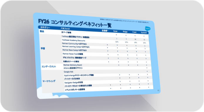 FY26 コンサルティングベネフィット一覧 製品 次ページ参照 ● ● ● ● 学習 Trailhead認定資格バウチャー無償提供 3 5 10 15 Trailhead Academy Discounts 15% 20% 25% 30% Partner Communityへのアクセス ● ● ● ● ● Partner Learning Campへのアクセス ● ● ● ● ● Partner Base Campへのアクセス ● ● ● ● ● Partner News Flashの配信 ● ● ● ● ● デモ/トライアル /開発環境ページ ● ● ● ● ● 各種セミナーへの参加 ● ● ● ● ● エンゲージメント Partner Advisory Board ● ● ● ● Alliance担当者のアサイン ● マーケティング Google Ads ● AppExchangeサイトへのリスティング掲載 ● ● ● ● パートナーロゴの利用 ● ● ● ● Navigator Badgeの利用 ● ● ● ● パートナーサミットへの参加または視聴 ● ● ● ● ● イベントスポンサー出展資格 ● ● ● ● ● カテゴリー ベネフィット 仮登録* Base Ridge Crest Summit 41 *仮登録とは、現行のプログラム参加要件を充足していないコンサルティングパートナー認定前の状態を指します。