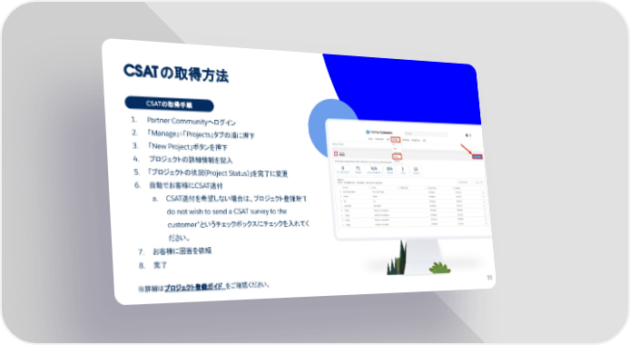 CSATの取得方法 1. Partner Communityへログイン 2. 「Manage」⇨「Projects」タブの順に押下 3. 「New Project」ボタンを押下 4. プロジェクトの詳細情報を記入 5. 「プロジェクトの状況(Project Status)」を完了に変更 6. 自動でお客様にCSAT送付 a. CSAT送付を希望しない場合は、プロジェクト登録時“I do not wish to send a CSAT survey to the customer”というチェックボックスにチェックを入れてく ださい。 7. お客様に回答を依頼 8. 完了 ※詳細はプロジェクト登録ガイド をご確認ください。 CSATの取得手順 51