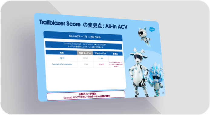 All-in ACV — 175 -> 200 Points Trailblazer Score の変更点: All-in ACV 合計ポイントが増加 Sourced ACVアクセラレータのターゲット金額が減少 All-in ACV (Sourced + Joint Sales + Internal Use)の ターゲット達成率によりポイント加算 (年度累計) 地域 FY25 ターゲット FY26 ターゲット 変更点 Japan $1.5M $1.5M Sourced ACV Accelerator $2M $1M▼ ターゲット金額が減少したこ とで、ポイントを獲得しやすく なります。 26