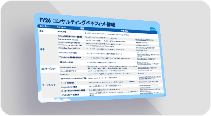 製品 次ページ参照 社内利用、ソリューションセリング、トレーニング目的のライセンス/Orgへのアクセス - 学習 Trailhead認定資格バウチャー無償提供 Tierに応じ3-15枚の認定試験無償バウチャーを申請可能 Partner Communityをご確認ください Trailhead Academy Discounts Tierに基づく割引率で有料トレーニングと一括購入バウチャーを購入可能 関連資料をご確認ください Partner Communityへのアクセス Salesforceパートナー様がご利用いただける情報コミュニティサイト Help記事をご確認ください Partner Learning Campへのアクセス パートナー様向けのオンライン学習プラットフォーム Partner Community をご確認ください Partner Base Campへのアクセス パートナー様向けの日本語情報をカテゴリ別に集約したナレッジサイト Partner Base Camp Partner News Flashの配信 月に一度パートナー様へ送付される重要な情報をまとめたメール Partner Community Japan Partners (Official) に参加されている方 に配信します デモ/トライアル/開発環境紹介資料 パートナー様にご利用いただける各種デモ/トライアル/開発環境を紹介する資料 Partner Base Camp をご確認ください 各種セミナーへの参加 パートナー様向け最新情報をお伝えする各種セミナー Partner Community Events for Japan Partners よりご案内します エンゲージメント Partner Advisory Board US本社のコンサルティングパートナープログラム担当者からの情報収集・フィードバック提供 機会 (日本国外で英語にて実施されるため、関連情報は英語でのみ提供) Partner Communityをご確認ください Alliance担当者のアサイン Salesforceとの連絡窓口となるパートナー担当営業 (PAM) のアサイン Salesforceよりご案内します マーケティング Google Ads Salesforceのブランドを活用したGoogle広告で、デジタルのエンゲージを高める ケース起票 AppExchangeサイトへのリスティング掲載 AppExchangeサイトへのパートナー様情報の公開 AppExchangeサイトにコンサルティングパート ナーの会社概要を公開する方法 パートナーロゴの利用 マーケティング販促物、及びプレスリリースでご利用いただけるパートナーロゴの提供 Partner Community よりダウンロード Navigator Badgeの利用 Navigatorを取得されたパートナー様が利用可能なバッジ Partner Community よりダウンロード パートナーサミットへの参加または視聴 年に1度開催されるSalesforceパートナー様向けイベント Partner Community Japan Partners (Official) よりご案内します イベントスポンサー出展資格 Salesforce主催の各種イベントにスポンサーとして出展可能 (各イベントの協賛プログラムに 準ずる) Partner Community Japan Partners (Official) よりご案内します FY26 コンサルティングベネフィット詳細 カテゴリー ベネフィット 概要 申請方法 43