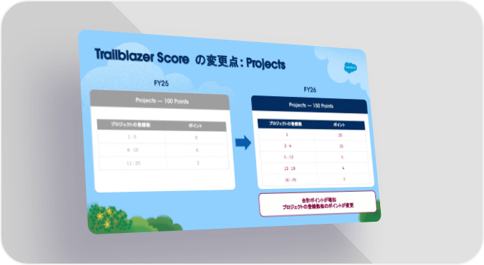 Trailblazer Score の変更点: Projects Projects — 150 Points プロジェクトの登録数 ポイント 1 25 2 - 4 15 5 - 12 5 13 - 19 4 20 - 25 2 Projects — 100 Points プロジェクトの登録数 ポイント 1 - 5 8 6 - 10 6 11 - 25 2 合計ポイントが増加 プロジェクトの登録数毎のポイントが変更 FY25 FY26 25