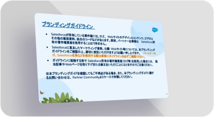 ブランディングガイドライン 8 ● Salesforceが所有している著作権には、ロゴ、 Webサイトのデザインとコンテンツ、ビデオと その他の販促資料、独自のコードなどがあります。原則、パートナー企業様は Salesforce所 有の著作権資産を使用することはできません。 ● Salesforceに言及したマーケティング資料、公開 Webサイト等については、本ブランディング ガイドラインをご確認の上、適切に表記いただけますようお願い申し上げます。 パートナーロ ゴ、Salesforce名称などを使用する際は事前にガイドラインを必ずご確認ください。 ● ガイドラインに抵触する形で Salesforce所有の著作権資産(ロゴ等)を使用した場合には、 該 当記事やWebページを取り下げまたは修正をいただくことになりますのでご注意ください。 ※本ブランディングガイドを確認してもご不明点がある場合、また、本ブランディングガイドに関す るお問い合わせは、 Partner Communityよりケースで申請してください。