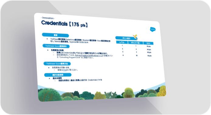 - Innovation - Credentials 【175 pts】 概要 Trailblazer Score獲得要件 Trailblazer Score獲得方法 集計対象期間 ● Trailhead認定資格(Salesforce認定資格・ MuleSoft認定資格・ Slack認定資格を含 む)、Tableau認定資格、 Superset等の資格の総称 ● 各種資格の取得 ○ 取得したCredentialsのレベルによって獲得できるポイントが異なります。 ○ 認定資格毎のレベルは、Partner Program Certificationsページに記載されてい る “Consulting Program Level” をご確認ください。 ● 各種資格の受験・合格 ○ 詳細はP.56をご覧ください。 ● 過去全期間 ○ (現在も有効な ) 過去に取得した全ての Credentials が対象 レベル ポイント (各) MAX 1 1 30 pts 2 2 40 pts 3 3 80 pts 4 10 50 pts ポイント配分 54