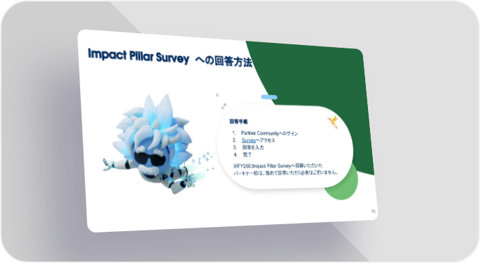 [Internnal/External] FY26 Page 75 Page 77Impact Pillar Survey への回答方法 回答手順 1. Partner Communityへログイン 2. Surveyへアクセス 3. 回答を入力 4. 完了 ※FY25にImpact Pillar Surveyへ回答いただいた パートナー様は、改めて回答いただく必要はございません。 76