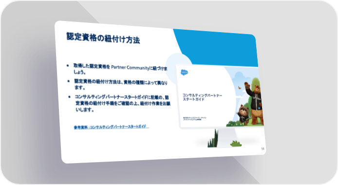 [Internnal/External] FY26 Page 57 Page 59● 取得した認定資格を Partner Communityに紐づけま しょう。 ● 認定資格の紐付け方法は、資格の種類によって異なり ます。 ● コンサルティングパートナースタートガイドに記載の、認 定資格の紐付け手順をご確認の上、紐付け作業をお願 いします。 参考資料 :コンサルティングパートナースタートガイド 認定資格の紐付け方法 58