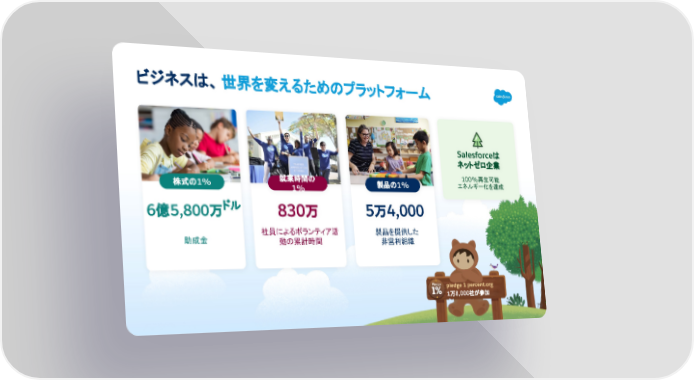 5万4,000 製品を提供した 非営利組織 製品の1% 830万 社員によるボランティア活 動の累計時間 就業時間の 1% 6億5,800万ドル 助成金 株式の1% Salesforceは ネットゼロ企業 100%再生可能 エネルギー化を達成 ビジネスは、 世界を変えるためのプラットフォーム Pledge pledge 1 percent.org 1万8,000社が参加 79