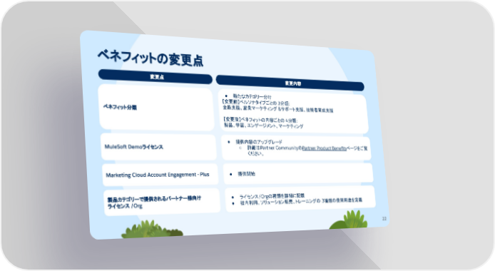22 ベネフィットの変更点 変更点 変更内容 ベネフィット分類 ● 新たなカテゴリー分け 【変更前】ペルソナタイプごとの 3分類: 全般支援、営業マーケティング &サポート支援、技術者育成支援 【変更後】ベネフィットの内容ごとの 4分類: 製品、学習、エンゲージメント、マーケティング MuleSoft Demoライセンス ● 提供内容のアップグレード ○ 詳細はPartner CommunityのPartner Product Benefitsページをご覧 ください。 Marketing Cloud Account Engagement - Plus ● 提供開始 製品カテゴリーで提供されるパートナー様向け ライセンス /Org ● ライセンス/Orgの種類を詳細に記載 ● 社内利用、ソリューション販売、トレーニングの 3種類の使用用途を定義