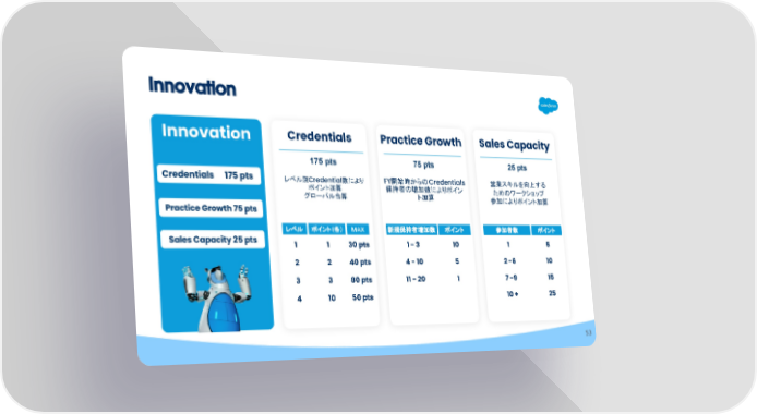 Innovation Innovation レベル別Credential数により ポイント加算 グローバル合算 Credentials レベル ポイント(各) MAX 1 1 30 pts 2 2 40 pts 3 3 80 pts 4 10 50 pts FY開始時からのCredentials 保持者の増加数によりポイン ト加算 Practice Growth 新規保持者増加数 ポイント 1 - 3 10 4 - 10 5 11 - 20 1 175 pts Innovation Credentials 175 pts Practice Growth 75 pts Sales Capacity 25 pts 75 pts 営業スキルを向上する ためのワークショップ 参加によりポイント加算 Sales Capacity 参加者数 ポイント 1 5 2 -6 10 7 -9 15 10 + 25 25 pts 53