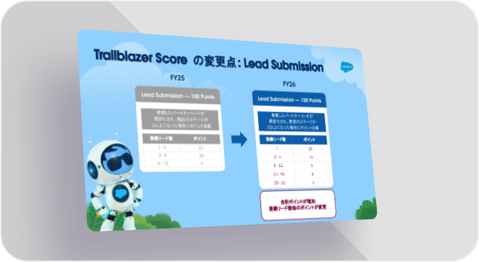 Trailblazer Score の変更点: Lead Submission Lead Submission — 150 Points 登録したパートナーリードが 商談化され、商談のステージが 2以上になった場合にポイント加算 登録リード数 ポイント 1 25 2 - 4 15 5 - 12 5 13 - 19 4 20 - 25 2 Lead Submission — 100 Points 登録したパートナーリードが 商談化され、商談のステージが 2以上になった場合にポイント加算 登録リード数 ポイント 1 - 2 15 3 - 5 10 6 - 15 4 FY25 FY26 合計ポイントが増加 登録リード数毎のポイントが変更 27