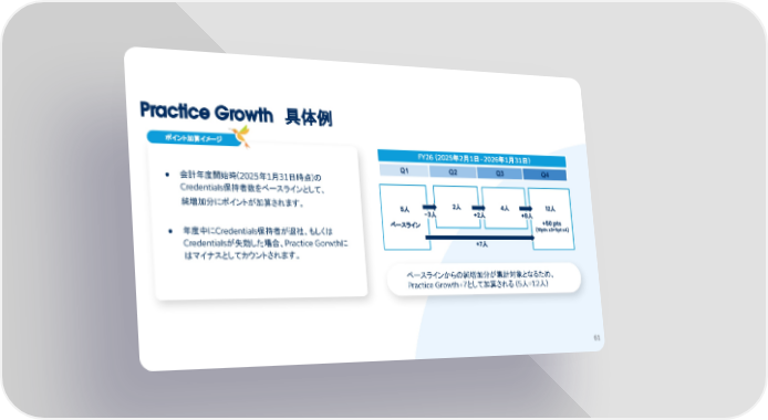 Practice Growth 具体例 ● 会計年度開始時(2025年1月31日時点)の Credentials保持者数をベースラインとして、 純増加分にポイントが加算されます。 ● 年度中にCredentials保持者が退社、もしくは Credentialsが失効した場合、Practice Gorwthに はマイナスとしてカウントされます。 ポイント加算イメージ 5人 ベースライン 2人 12人 +50 pts (10pts x3+5pt x4) +7人 4人 -3人 +2人 +8人 ベースラインからの純増加分が集計対象となるため、 Practice Growth+7として加算される (5人⇨12人) FY26 (2025年2月1日~2026年1月31日) Q1 Q2 Q3 Q4 61