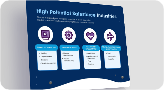 High Potential Salesforce Industries Choose to expand your Navigator expertise in these industries. Explore how these solutions are helping to drive customer success. FINANCIAL SERVICES > MANUFACTURING > HEALTHCARE & TRAVEL, TRANSPORTATION LIFE SCIENCES > & HOSPITALITY > Banking Discrete Health Plans Travel Capital Markets Manufacturing Medical Devices & Transportation Insurance Process Diagnostics Hospitality Manufacturing Payer Wealth Management Providers