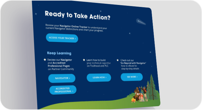 Ready to Take Action? Review your Navigator Online Tracker to understand your current Navigator distinctions and chart your progress. ACCESS YOUR TRACKER > Keep Learning Review our Navigator Learn how to build Check out our and Accredited your technical expertise “Go Beyond with Navigator” Professional Pages on Trailhead and PLC how-to eBook for on Partner Community step-by-step details NAVIGATOR > LEARN HOW > SEE MORE > ACCREDITED PROFESSIONAL >