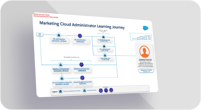 Credentials Legend Trailhead Content Data Cloud Admin Tools Courses ~5 hours Salesforce Administrator Certification Marketing Cloud Administrator Learning Journey START HERE MC Administrator Curriculum ~19 hours MC Administrator Certification Personalization Admin Tools Courses ~4 hours Intelligence Admin Tools Courses ~3 hours Salesforce Administrator Curriculum ~56 hours Account Engagement Specialist Curriculum ~15 hours Account Engagement Specialist Certification ADMINISTRATOR Responsible for platform configuration and maintenance, running and operating solution with no- to low-coding experience. Estimated hours to complete all courses: ~90 Partner Success Owner: Andrew Kazmierczak & Stacy Jacobs *Optional learning and certification. *Optional learning and certification. Learning Time MC Administrator ~ 19 hrs Salesforce Administrator ~ 56 hrs Account Engagement (AE) Specialist ~ 15 hrs Partner Learning Camp Content