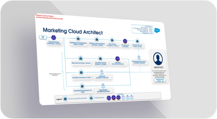 Marketing Cloud Architect ARCHITECT Use case centric experts, align business problems with functional platform capabilities. Responsible for the solution design. Estimated hours to complete ~ 101 Partner Success Owner: Andrew Kazmierczak & Stacy Jacobs Learning Time: MC Consultant ~ 38 hrs MC Advanced Cross-Channel AP ~ 18 hrs Data Cloud Certification ~ 22 hrs Personalization AP ~ 20 hrs Intelligence AP ~ 3 hrs START HERE MC Consultant Curriculum ~17 hours Personalization Accredited Professional Personalization Curriculum ~20 hours Intelligence Accredited Professional Intelligence Curriculum ~3 hours Data Cloud Curriculum ~11 hours Data Cloud Consultant Certification MC Administrator Certification ~19 hours Einstein for Marketing Cloud Curriculum ~10 hours Data Cloud: Practical Experience ~11 hours *Optional learning and certification. MC Consultant Certification Marketing Cloud Engagement: Mobile ~11 hours MC Advanced Cross Channel ~18 hours MC Advanced Cross Channel Accredited Professional Credentials Legend Trailhead Content Partner Learning Camp Content