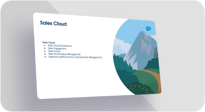 Sales Cloud Sales Cloud ● Sales Cloud Enablement ● Sales Engagement ● Sales Cloud ● Sales Performance Management ● Salesforce Spiff (Incentive Compensation Management)