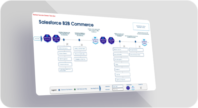 Salesforce B2B Commerce Blue Text Planned Grey Text Credentials Available Course or Curriculum Hands-On Learning Tracks Legend Third Party Learning Partner Success Owner: Tom Zarr Partner Community Platform Features Data Management Process Automation Salesforce Commerce for B2B Administrator Accredited Professional Get to Know Salesforce Commerce for B2B for Administrators Salesforce Commerce for B2B Developer Accredited Professional Salesforce Commerce for B2B Foundations for Administrators Get to Know Salesforce Commerce for B2B for Developers Salesforce Commerce for B2B Foundations for Developers Setting up Environments Deploying the Storefront Managing the Storefront Platform Overview Developer Essentials Advanced Developer Topics START HERE Administrator = 22 hrs Developer = 32 hrs Commerce, Experiences and Content Apex and Database APIs & Integrations Tooling Visualforce Javascript Lightning Components