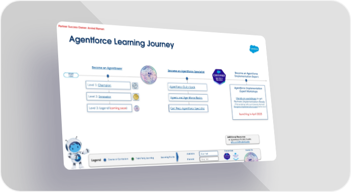 Agentforce Learning Journey Blue Text Planned Grey Text Credentials Available Course or Curriculum Hands-On Learning Tracks Legend Third Party Learning Additional Resources ● Agentforce Pocket Guide: sfdc.co/AIPocketGuide START HERE Level 1: Champion Level 2: Innovator Become an Agentblazer Become an Agentforce Specialist Level 3: Legend (coming soon) Agentforce: Quick Look Agents and Agentforce Basics Cert Prep: Agentforce Specialist Become an Agentforce Implementation Expert Agentforce Implementation Expert Workshops Hands on workshops to get Partners Implementation Ready (This workshop will count towards Partners Navigator Implementation Expert Distinction) launching in April 2025 Partner Success Owner: Arvind Raman