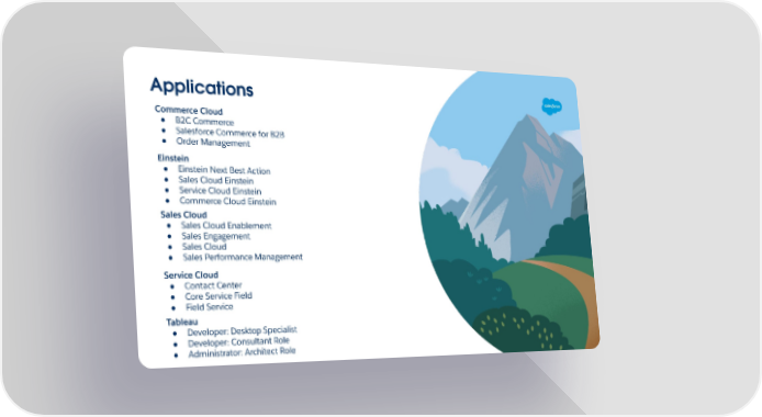Applications Commerce Cloud ● B2C Commerce ● Salesforce Commerce for B2B ● Order Management Einstein ● Einstein Next Best Action ● Sales Cloud Einstein ● Service Cloud Einstein ● Commerce Cloud Einstein Sales Cloud ● Sales Cloud Enablement ● Sales Engagement ● Sales Cloud ● Sales Performance Management Service Cloud ● Contact Center ● Core Service Field ● Field Service Tableau ● Developer: Desktop Specialist ● Developer: Consultant Role ● Administrator: Architect Role