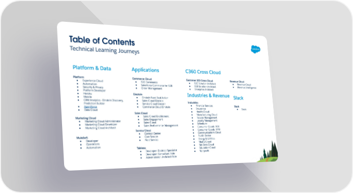 Table of Contents Technical Learning Journeys Platform & Data Platform ● Experience Cloud ● Automation ● Security & Privacy ● Platform Developer ● Heroku ● Mobile ● CRM Analytics - Einstein Discovery, Prediction Builder ● Agentforce ● Data Cloud Marketing Cloud ● Marketing Cloud Administrator ● Marketing Cloud Developer ● Marketing Cloud Architect MuleSoft ● Developer ● Operations ● Automation Applications Commerce Cloud ● B2C Commerce ● Salesforce Commerce for B2B ● Order Management Einstein ● Einstein Next Best Action ● Sales Cloud Einstein ● Service Cloud Einstein ● Commerce Cloud Einstein Sales Cloud ● Sales Cloud Enablement ● Sales Engagement ● Sales Cloud ● Sales Performance Management Service Cloud ● Contact Center ● Core Service ● Field Service Tableau ● Developer: Desktop Specialist ● Developer: Consultant Role ● Administrator: Architect Role C360 Cross Cloud Customer 360 Cross Cloud ● B2C Solution Architect ● B2B Solution Architect ● Enterprise Architect Slack Slack ● Slack Industries & Revenue Industries ● Financial Services ● Insurance ● Health Cloud ● Manufacturing Cloud ● Rebate Management ● Loyalty Management ● Scheduler ● Consumer Goods: REX ● Consumer Goods: TPM ● Communications Cloud ● Public Sector ● Energy & Utilities ● Media Cloud ● Net Zero Cloud ● Education Cloud ● Nonprofit Revenue Cloud ● Revenue Cloud ● Revenue Intelligence