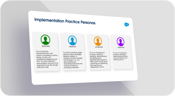 You turn business requirements into code, conduct unit testing, as well as deploy, monitor, and troubleshoot integrations and APIs. You write software to solve problems and want to be empowered to go fast and get stuff done easily. DEVELOPER You make project-level design decisions and are the bridge between solutions or enterprise architect managers and developers. You care about architectural repeatability and ensure new projects are delivered according to standards. ARCHITECT You are an IT professional, focusing on deploying, managing, capacity planning, monitoring, and/or troubleshooting integrations, APIs, or both. You care about automating and streamlining the integration and deployment processes. AUTOMATION You are an IT professional focusing on developing hyperautomation solutions across the Salesforce and MuleSoft products OPERATIONS Implementation Practice Personas