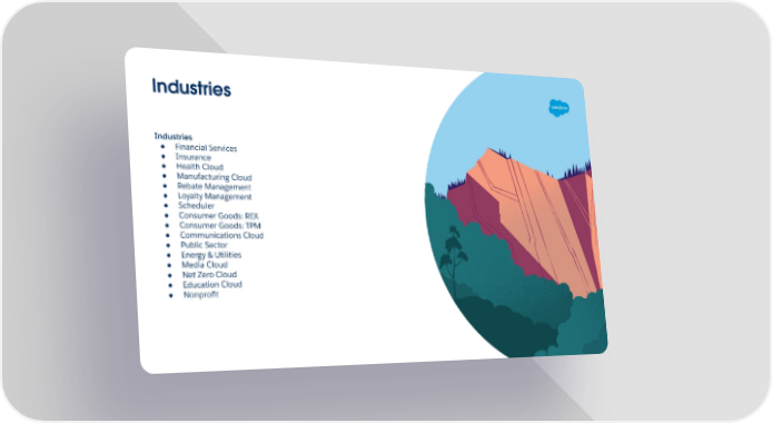 Industries Industries ● Financial Services ● Insurance ● Health Cloud ● Manufacturing Cloud ● Rebate Management ● Loyalty Management ● Scheduler ● Consumer Goods: REX ● Consumer Goods: TPM ● Communications Cloud ● Public Sector ● Energy & Utilities ● Media Cloud ● Net Zero Cloud ● Education Cloud ● Nonprofit