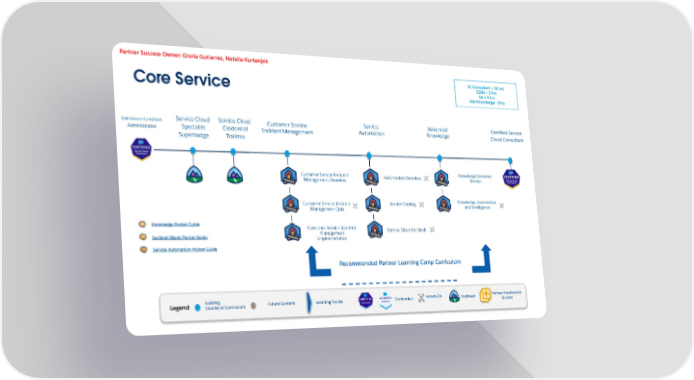 Core Service Partner Success Owner: Gloria Gutierrez, Natalia Kurtanjek Knowledge Pocket Guide Incident Mgmt Pocket Guide Service Automation Pocket Guide Certified Service Cloud Consultant Customer Service Incident Management Service Automation Automation Overview Service Catalog Customer Service Incident Management Overview Customer Service Incident Management Implementation Service Cloud Specialist Superbadge Customer Service Incident Management Quiz Service Cloud for Slack Service Cloud Credential Trailmix Advanced Knowledge Knowledge Centered Service Knowledge, Automation and Intelligence Salesforce Certified Administrator Recommended Partner Learning Camp Curriculum SC Consultant = 35 hrs CSIM = 3 hrs SA = 3 hrs Adv Knowledge - 3hrs Credentials Existing Course or Curriculum Hands-On Learning Tracks Legend Future Content Trailhead Partner Enablement Success