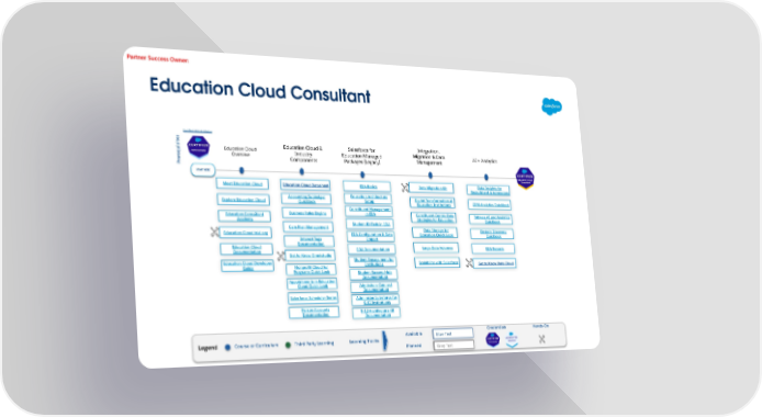 Education Cloud Consultant Blue Text Planned Grey Text Credentials Available Course or Curriculum Hands-On Learning Tracks Legend Third Party Learning START HERE Certified Administrator Prerequisites Salesforce for Education Managed Packages (Legacy) Education Cloud & Industry Components Integration, Migration & Data Management AI + Analytics Education Cloud Overview Data Migration Kit Digital Transformation at Education Institutions Constituent-Centric Data Strategies for Education Data Storage for Education Quick Look Large Data Volumes Scalability with Salesforce EDA Basics Education Architecture Setup Student Engagement for Institutions Constituent Management in EDA Student ID Field in EDA EDA Configuration & Data Import EDA Documentation Admissions Connect Documentation Student Success Hub Documentation K-12 Architecture Kit Documentation Administer Salesforce for K-12 Institutions Meet Education Cloud Explore Education Cloud Education Consultant Academy Education Cloud trial org Education Cloud Documentation Education Cloud Developer Guide Education Cloud Datasheet Accounting Subledger Quicklook Business Rules Engine Care Plan Management Get to Know Omnistudio Nonprofit Cloud for Programs Quick Look Salesforce Scheduler Series Interest Tags Documentation Appointments in Education Cloud Quick Look Person Accounts Documentation Data Insights for Recruitment & Admissions CRM Analytics Quicklook Tableau AI and Analytics Quicklook Einstein Discovery Quicklook EDA Reports Get to Know Data Cloud Partner Success Owner: