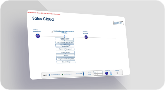 Sales Cloud Blue Text Planned Grey Text Credentials Available Course or Curriculum Hands-On Learning Tracks Legend Third Party Learning Partner Success Owner: Eric Chen ([email protected]) Get Started on Sales Cloud Fast Path to Certification Foundation Project Implementation Lead & Campaign Management Account & Campaign Management Opportunity Management Sales Productivity Sales Cloud Consultant Certified Administrator Analytics Integration & Data Management Administrator = 70 hrs SC Consultant = 40 hrs Solution Design