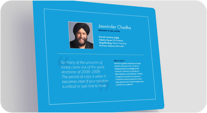 Jaswinder Chadha President & CEO, Axtria Current venture: Axtria Industry focus: Life Sciences Stage/funding: Series D funding Previous ventures: MarketRx So many of the unicorns of About Axtria Axtria is a global software and data today came out of the great analytics provider that combines strong process knowledge of life recession of 2008–2009. sciences commercial operations, The period of crisis is when it data analytics, and software. It helps companies transform the product becomes clear if your solution commercialization journey to drive sales growth and improve healthcare is critical or just nice to have. outcomes for patients. 14