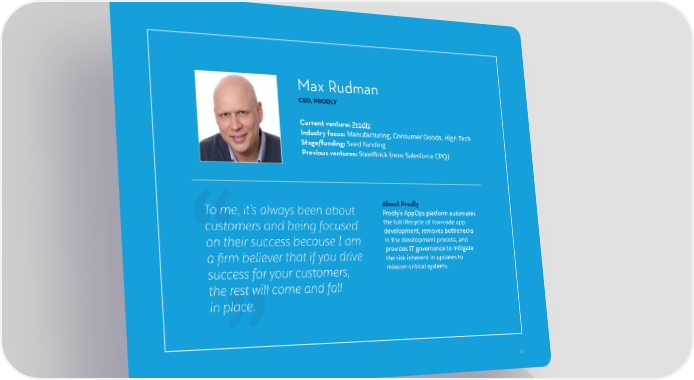 Max Rudman CEO, Prodly Current venture: Prodly Industry focus: Manufacturing, Consumer Goods, High Tech Stage/funding: Seed funding Previous ventures: SteelBrick (now Salesforce CPQ) To me, it’s always been about About Prodly Prodly’s AppOps platform automates customers and being focused the full lifecycle of low-code app development, removes bottlenecks on their success because I am in the development process, and a firm believer that if you drive provides IT governance to mitigate the risk inherent in updates to success for your customers, mission-critical systems. the rest will come and fall in place. 18