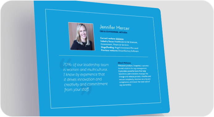 Jennifer Mercer CEO & Co-Founder, Metazoa Current venture: Metazoa Industry focus: Healthcare & Life Sciences, Government, Financial Services Stage/funding: Angel investment/Pre-seed Previous ventures: DreamFactory Software 70% of our leadership team About Metazoa Metazoa’s product, Snapshot, is an end- is women and multicultural. to-end solution for org management. It provides powerful tools that help I know by experience that Salesforce administrators manage the it drives innovation and change and release process, visualize and reduce complexity, improve security and creativity and commitment compliance, and lower the total cost of org ownership. from your staff. 4