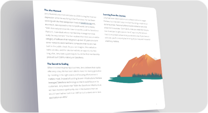 The Aha Moment Learning From the Journey Jerry Huskins’s aha moment dates to 2008 during the financial Jerry had never developed or sold software before he began depression while he was living in San Francisco. He had been Fonteva, but that didn’t stop him from founding a multimillion working with the first salesperson hired at Salesforce.org and, dollar business. Personal fulfillment and motivation are what as a result, was exposed to the nonprofit world. Jerry shares, drove him to success. “Don’t do it unless you really feel like you “With that early window into how nonprofits used the Salesforce love it and you’ve got a passion for it,” says Jerry. He believes Platform, I saw deals where membership management was that it’s important to love what you do every day. If you have an really the requirement.” He then realized that there was an entire exit plan, you’ll constantly be thinking of your way out instead of category of software that had grown up over 30 years on client- what truly matters. server networks and mainframe computers that no one had built in the public cloud. As you can imagine, this realization led to an idea, and the idea turned into an opportunity. Not long after, Jerry took a giant leap to found the first membership product built 100% natively on Salesforce. The Secret to Scaling When it comes to growing a business, Jerry believes that capital efficiency is key. He has been able to make his money go further by investing in the right places and focusing efforts where it matters most. Instead of building its own infrastructure, Fonteva leveraged Salesforce technology so that it could focus on its customers. Jerry shares that “With the Salesforce infrastructure, we have invested significantly less in this business than we would have had we built it on .NET or built a stand-alone Java application on AWS.” 7