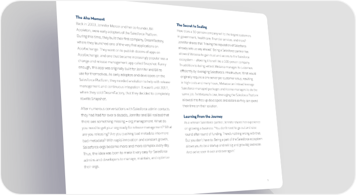 The Aha Moment The Secret to Scaling Back in 2003, Jennifer Mercer and her co-founder, Bill How does a 10-person company sell to the largest customers Appleton, were early adopters of the Salesforce Platform. in government, healthcare, financial services, and more? During this time, they built their first company, DreamFactory, Jennifer shares that “Having the reputation of Salesforce where they launched one of the very first applications on already sets us way ahead.” Being a Salesforce partner has AppExchange. They went on to publish dozens of apps on allowed Metazoa to gain trust and access to the Salesforce AppExchange, and one that became increasingly popular was a ecosystem — allowing it to sell like a 100-person company. change and release management app called Snapshot. Funny In addition to being vetted, Metazoa manages its customers enough, this app was originally built for Jennifer and Bill to efficiently by leveraging Salesforce’s infrastructure. What would use for themselves. As early adopters and developers on the originally require a one server per customer setup, resulting Salesforce Platform, they needed a solution to help with release in high costs and many hours, Metazoa can instead leverage management and continuous integration. It wasn’t until 2017, Salesforce-managed packages and license managers to do the when they sold DreamFactory, that they decided to completely same job. In Metazoa’s case, leveraging the Salesforce Platform rewrite Snapshot. allowed it to free up developers and dollars so they can spend their time on their solution. After numerous conversations with Salesforce admin contacts they had had for over a decade, Jennifer and Bill realized that Learning From the Journey there was something missing — org management. What do As a veteran Salesforce partner, Jennifer shares her experience you need to get your org ready for release management? What on growing a business: “You don’t need to go out and raise are you releasing? Are you pushing bad metadata into more round after round of funding. There’s nothing wrong with that. bad metadata? With rapid innovation and constant growth, But you don’t have to. Being a part of the Salesforce ecosystem Salesforce orgs become more and more complex every day. allows you to be a startup and sell big and grow big and scale. Thus, the idea was born to make it very easy for Salesforce And we’ve seen it over and over again.” admins and developers to manage, maintain, and optimize their orgs. 5