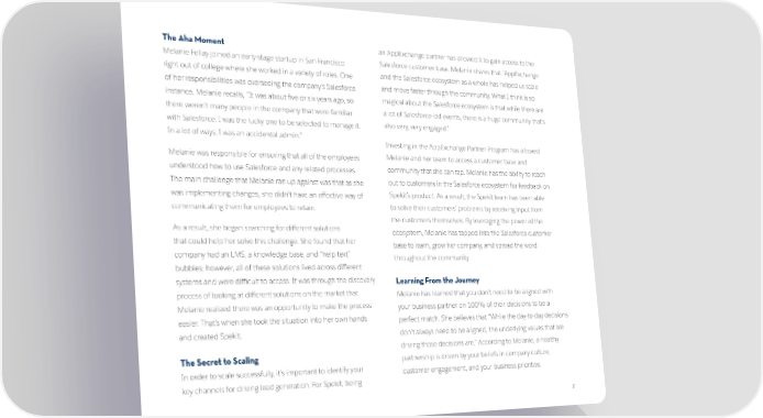 The Aha Moment an AppExchange partner has allowed it to gain access to the Melanie Fellay joined an early-stage startup in San Francisco Salesforce customer base. Melanie shares that “AppExchange right out of college where she worked in a variety of roles. One and the Salesforce ecosystem as a whole has helped us scale of her responsibilities was overseeing the company’s Salesforce and move faster through the community. What I think is so instance. Melanie recalls, “It was about five or six years ago, so magical about the Salesforce ecosystem is that while there are there weren’t many people in the company that were familiar a lot of Salesforce-led events, there is a huge community that’s with Salesforce. I was the lucky one to be selected to manage it. also very, very engaged.” In a lot of ways, I was an accidental admin.” Investing in the AppExchange Partner Program has allowed Melanie was responsible for ensuring that all of the employees Melanie and her team to access a customer base and understood how to use Salesforce and any related processes. community that she can tap. Melanie has the ability to reach The main challenge that Melanie ran up against was that as she out to customers in the Salesforce ecosystem for feedback on was implementing changes, she didn’t have an effective way of Spekit’s product. As a result, the Spekit team has been able communicating them for employees to retain. to solve their customers’ problems by receiving input from the customers themselves. By leveraging the power of the As a result, she began searching for different solutions ecosystem, Melanie has tapped into the Salesforce customer that could help her solve this challenge. She found that her base to learn, grow her company, and spread the word company had an LMS, a knowledge base, and “help text” throughout the community. bubbles; however, all of these solutions lived across different systems and were difficult to access. It was through the discovery Learning From the Journey process of looking at different solutions on the market that Melanie has learned that you don’t need to be aligned with Melanie realized there was an opportunity to make the process your business partner on 100% of their decisions to be a easier. That’s when she took the situation into her own hands perfect match. She believes that “While the day-to-day decisions and created Spekit. don’t always need to be aligned, the underlying values that are driving those decisions are.” According to Melanie, a healthy The Secret to Scaling partnership is driven by your beliefs in company culture, In order to scale successfully, it’s important to identify your customer engagement, and your business priorities. key channels for driving lead generation. For Spekit, being 17